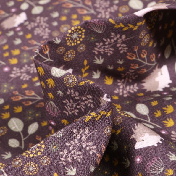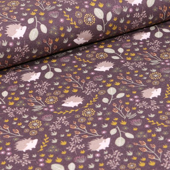 Tissu Coton imprimé Bio Hérissons et feuillages sur fond Prune foncé - Par 10 cm