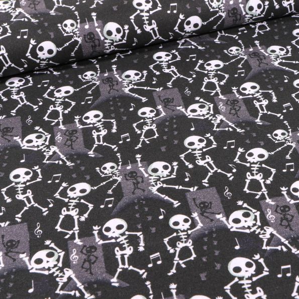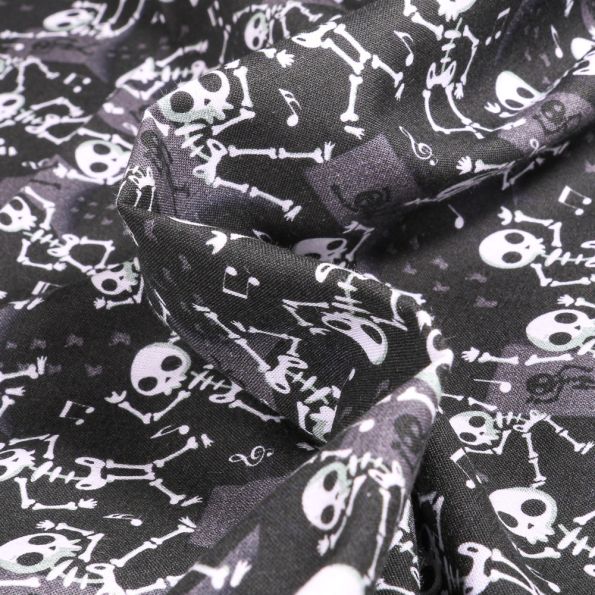 Tissu Coton imprimé Bio Squelettes d'halloween sur fond Noir - Par 10 cm
