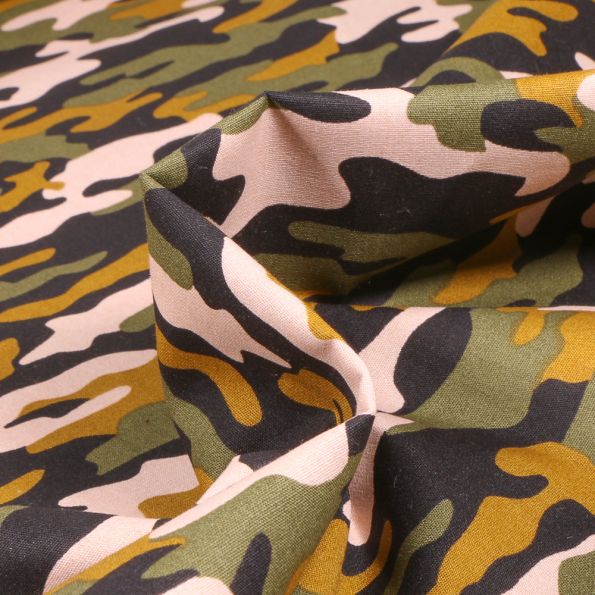 Tissu Coton imprimé Camouflage militaire sur fond Ocre - Par 10 cm