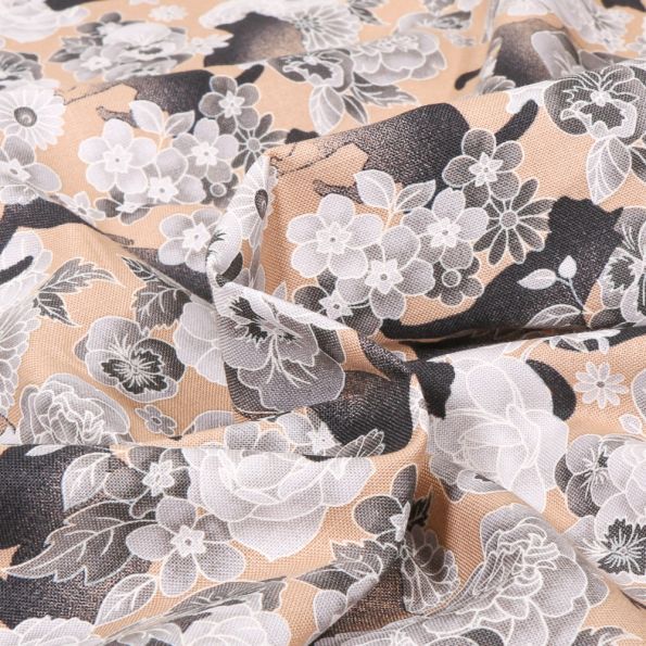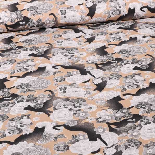 Tissu Coton imprimé Chats et fleurs sur fond Beige - Par 10 cm