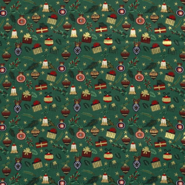 Tissu Coton imprimé Déco de Noël sur fond Vert sapin - Par 10 cm