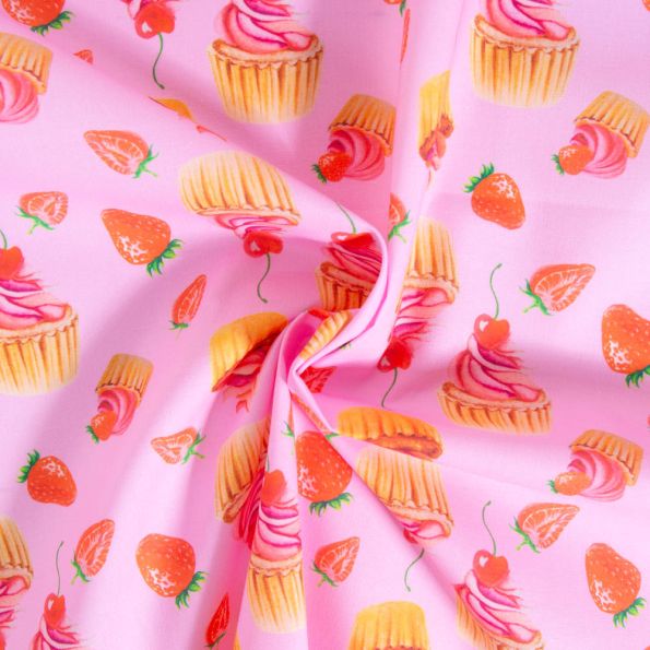 Tissu Coton imprimé Dessert fraise sur fond Rose - Par 10 cm