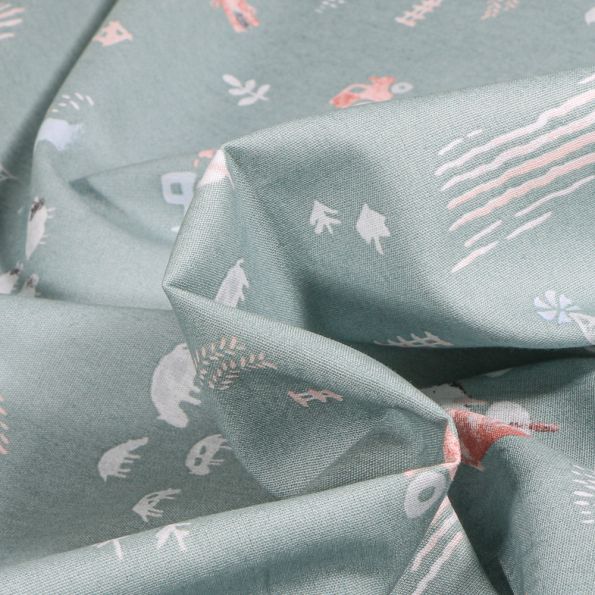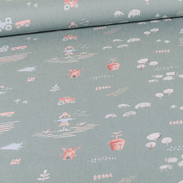 Tissu Coton imprimé Ferme de campagne sur fond Vert amande - Par 10 cm