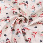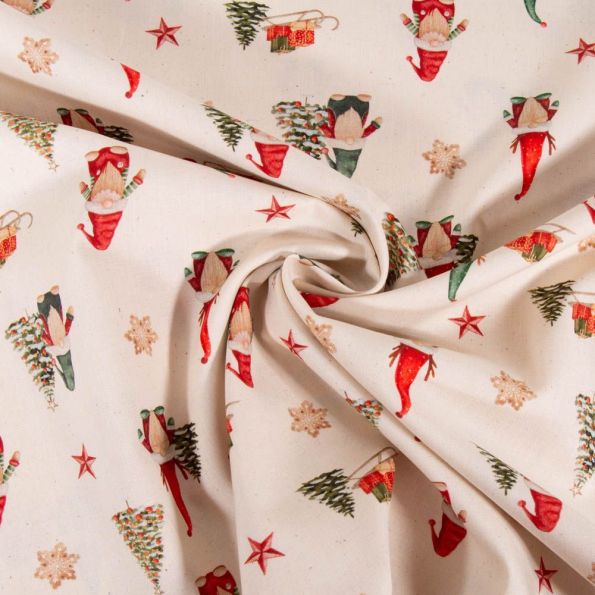 Tissu Coton imprimé Gnomes de Noël sur fond Ecru - Par 10 cm