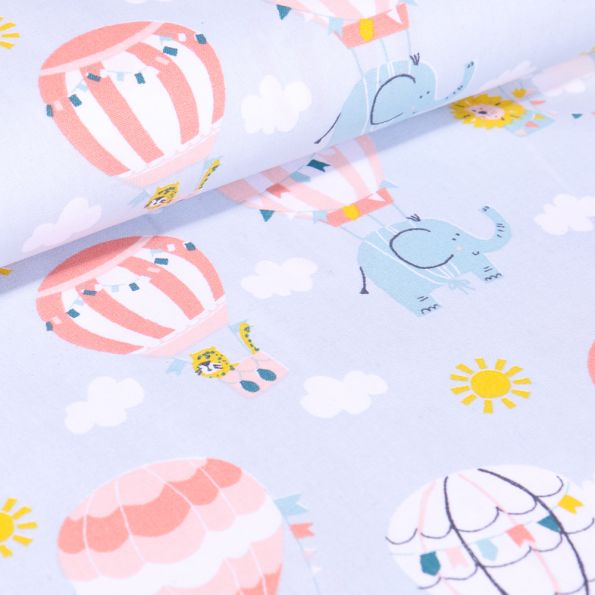 Tissu Coton imprimé LittleBird Montgolfière et animaux sur fond Bleu - Par 10 cm