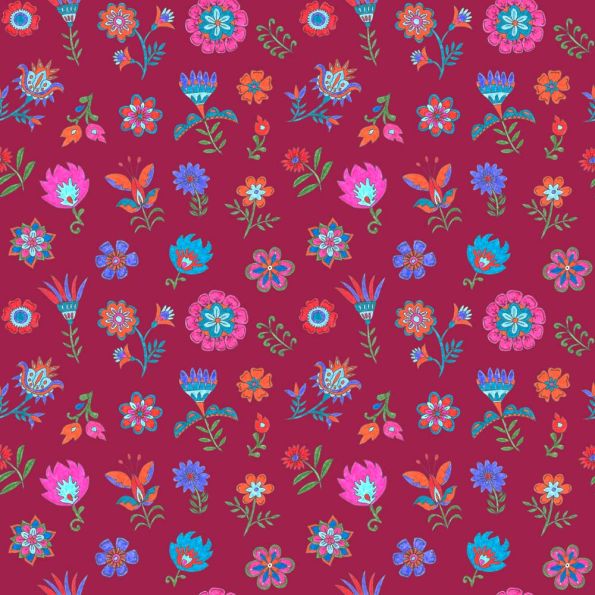 Tissu Coton imprimé Loulou fleuris sur fond Framboise - Par 10 cm
