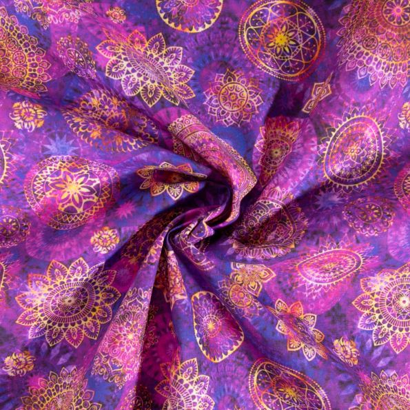 Tissu Coton imprimé Mandalas sur fond Violet - Par 10 cm