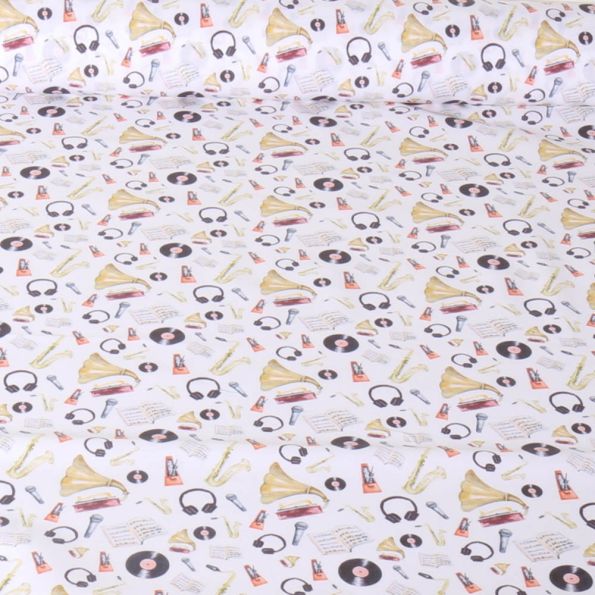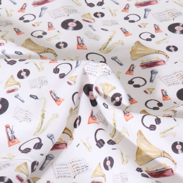 Tissu Coton imprimé Melo instruments musique vintage sur fond Blanc - Par 10 cm