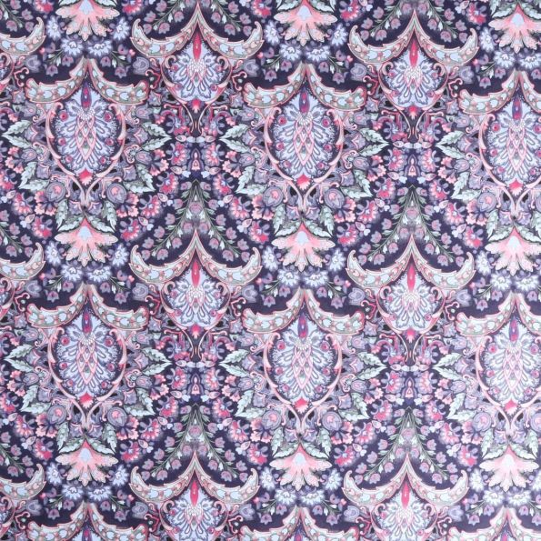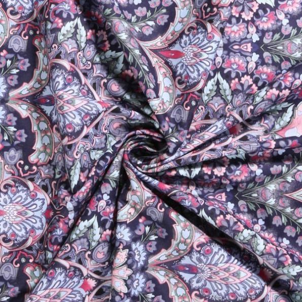 Tissu Coton imprimé Motifs Hindou roses, verts et bleus sur fond Bleu marine - Par 10 cm