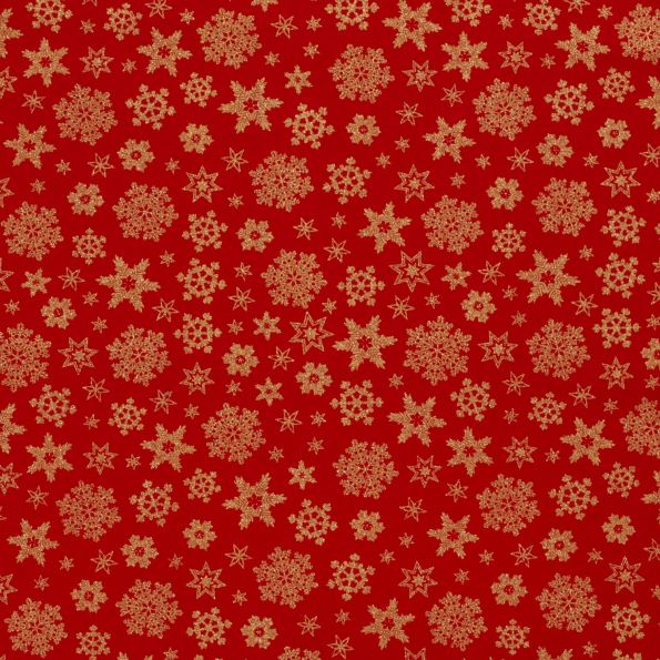 Tissu Coton imprimé Noël Flocons dorés sur fond Rouge - Par 10 cm