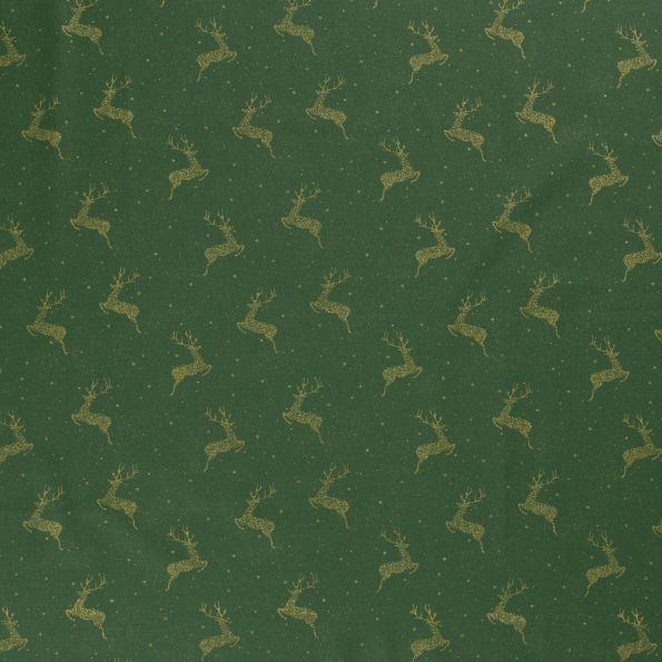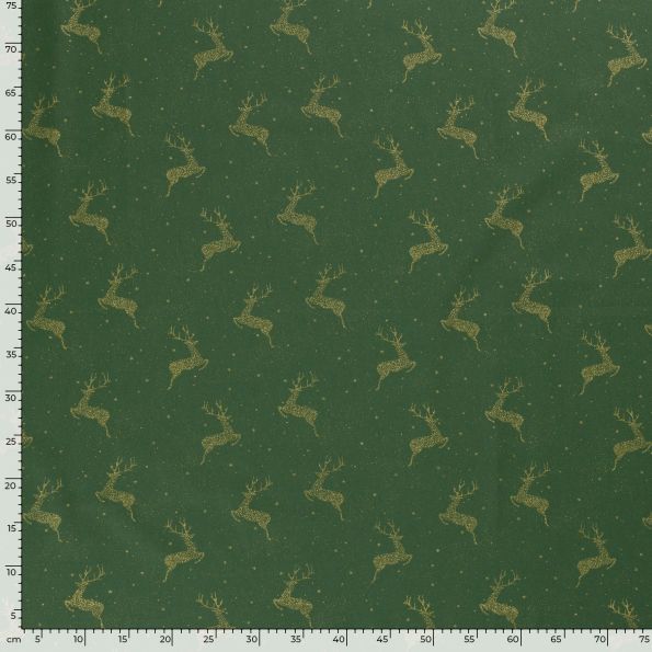 Tissu Coton imprimé Noël Rênes dorées sur fond Vert sapin - Par 10 cm