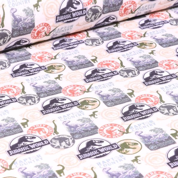 Tissu Coton imprimé sous licence Bio Jurassic World Logo sur fond Blanc cassé - Par 10 cm