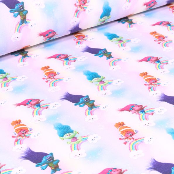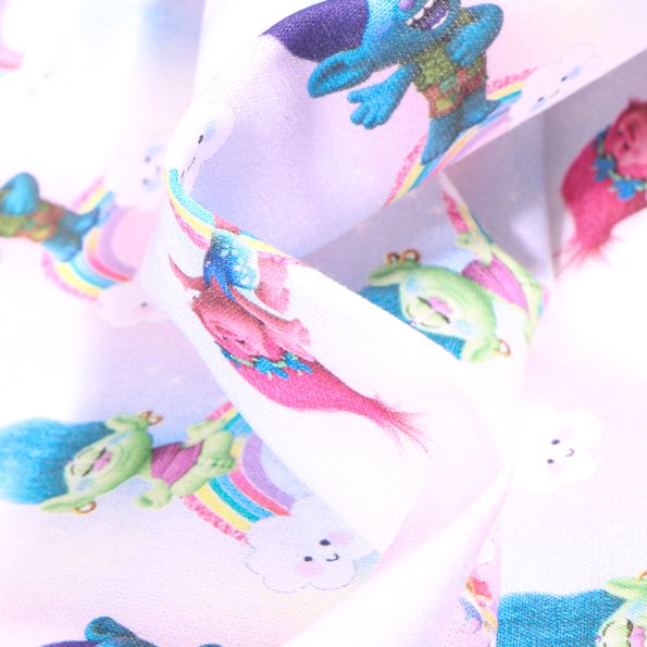 Tissu Coton imprimé sous licence Bio Trolls Rainbow sur fond Blanc - Par 10 cm