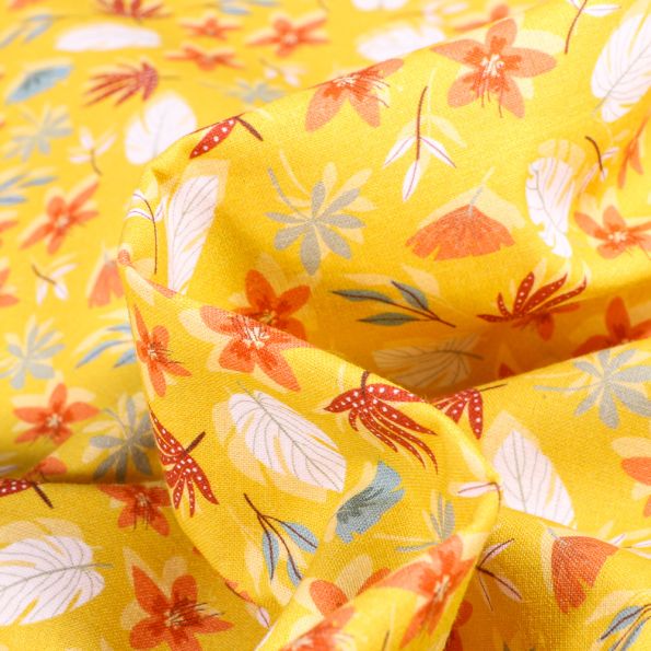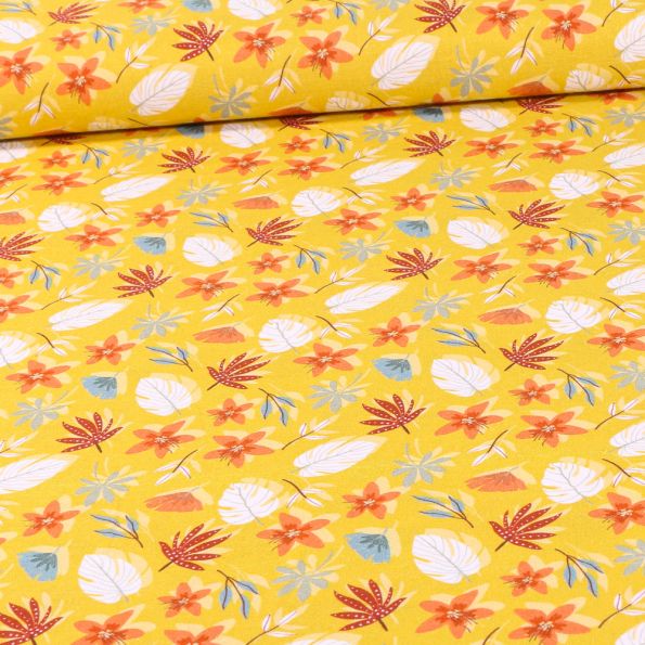 Tissu Coton imprimé Tropical sur fond Jaune - Par 10 cm