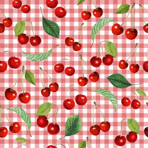 Tissu Coton imprimé Vichy rose et cerises sur fond Blanc - Par 10 cm