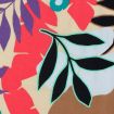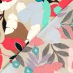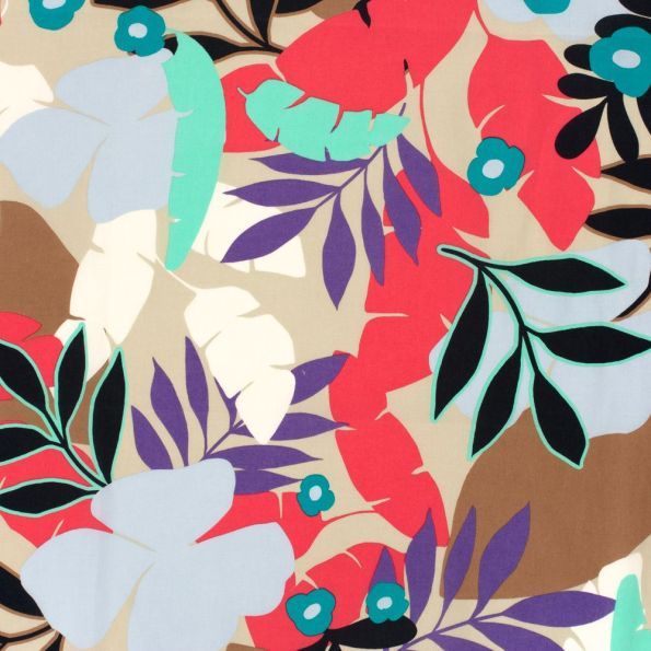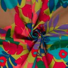 Tissu Coton stretch imprimé Feuilles noires, bleues et rouges sur fond Beige - Par 10 cm