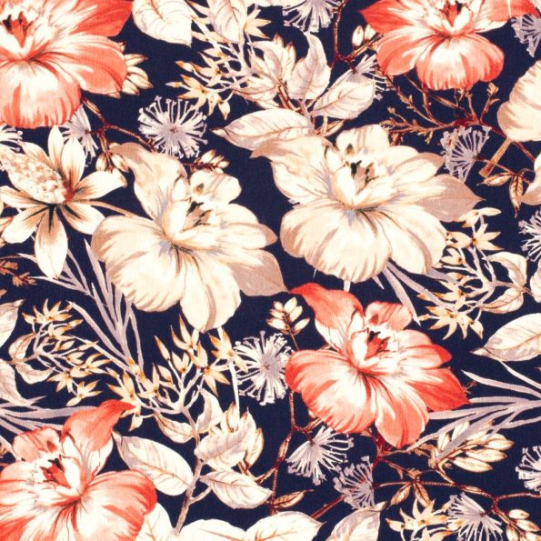 Tissu Crêpe de Viscose Fleurs Elo sur fond Bleu marine - Par 10 cm