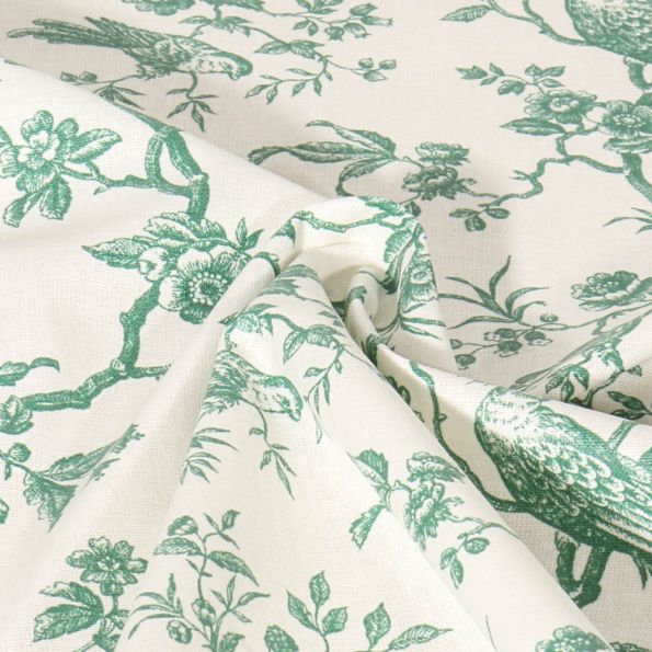 Apportez un charme naturel et raffiné à vos créations avec le tissu Jardin Nature, une cretonne de coton enduite au motif de style toile de Jouy. Imprimé sur un fond écru naturel, ce tissu met en scène des oiseaux, fleurs et feuillages dans un vert feuillage apaisant, pour une ambiance champêtre et élégante.Grâce à son enduction fine, il est facile à entretenir et résistant aux taches, parfait pour des nappes, coussins, sets de table, rideaux ou accessoires déco.