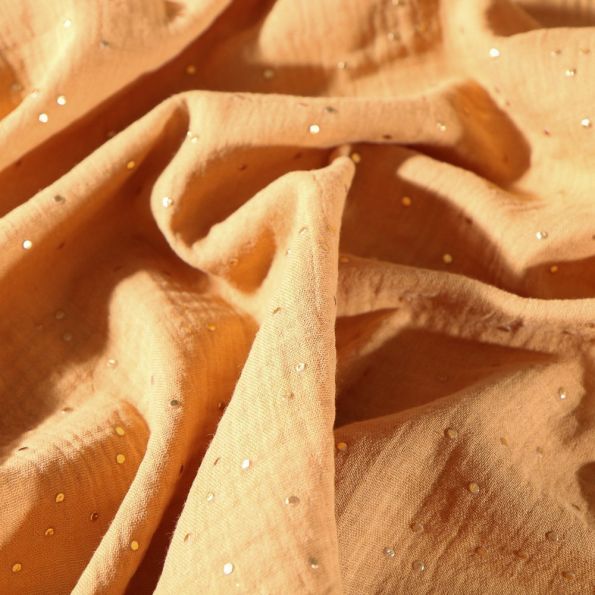 Tissu Double gaze Baya Pois dorés sur fond Camel - Par 10 cm