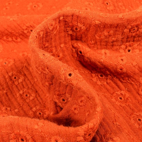 Tissu Double gaze Brodée Suzy sur fond Rouille - Par 10 cm