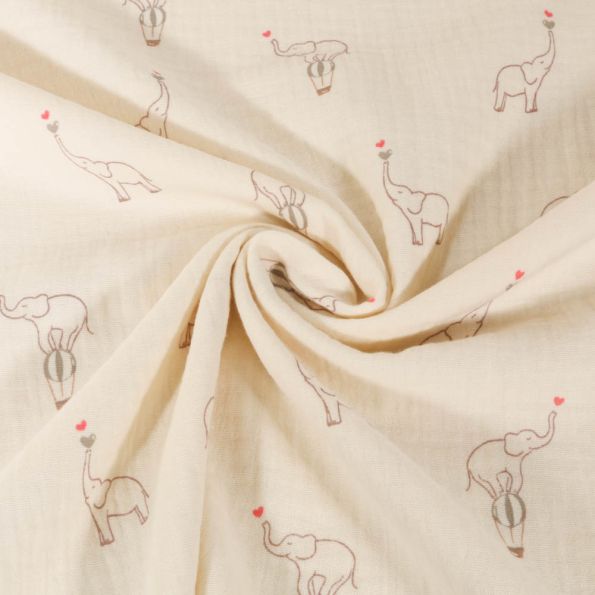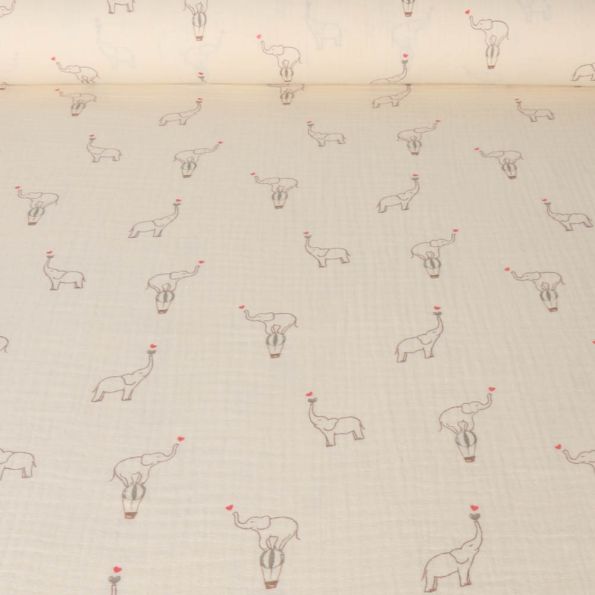 Tissu Double gaze Coton Eléphant Lumpy sur fond Ecru - Par 10 cm