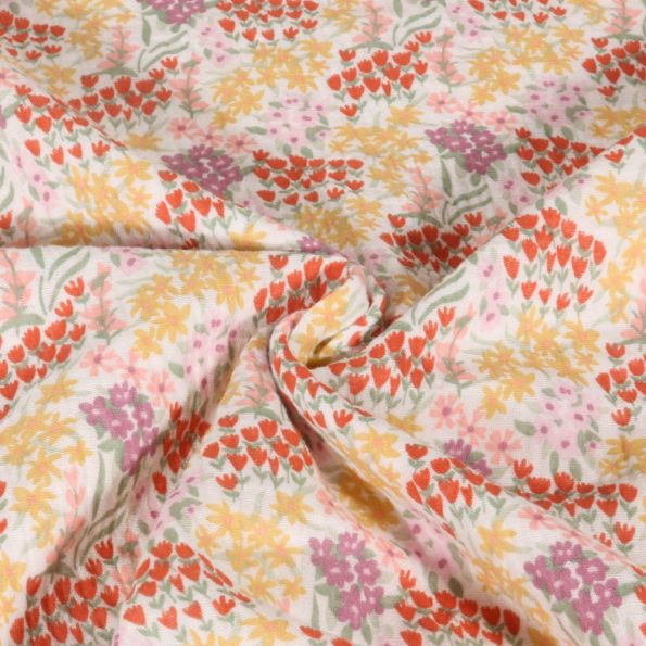 Le tissu double gaze de coton fleuri combine la douceur aérienne de la double gaze avec le charme intemporel du motif fleuris. Composé à 100% de coton, il est léger, respirant et délicatement froissé, offrant un effet naturel et bohème sans besoin de repassage. Polyvalent et confortable, il se prête parfaitement à la confection de vêtements fluides comme des blouses, robes, jupes ou pantalons légers. Il est aussi idéal pour l’univers de l’enfant avec des gigoteuses, langes, bloomers ou doudous. En décoration, il apportera une touche douce et vaporeuse à des rideaux, housses de coussins ou plaids légers. Un tissu idéal pour des créations légères et respirantes, parfaites pour toutes les saisons.