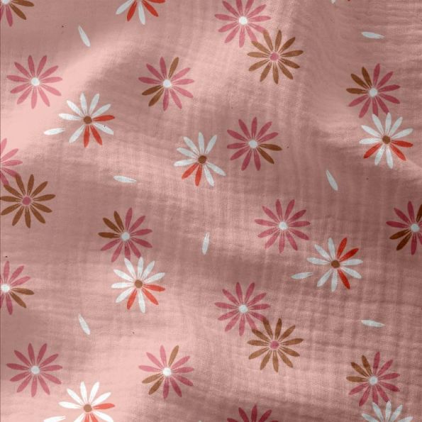 Tissu Double gaze imprimé Ada rose sur fond Rose blush - Par 10 cm