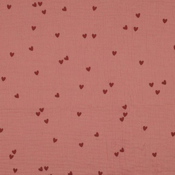 Tissu Double gaze Petits coeurs foncés sur fond Vieux rose - Par 10 cm