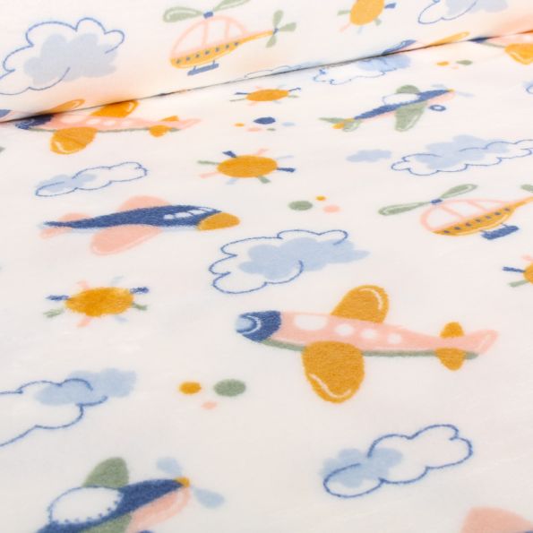 Tissu Doudou Avions et nuages sur fond Blanc - Par 10 cm