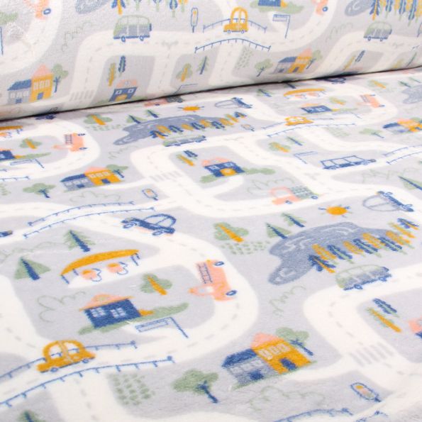 Tissu Doudou Winter village sur fond Blanc - Par 10 cm