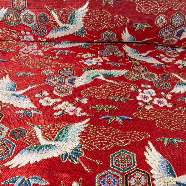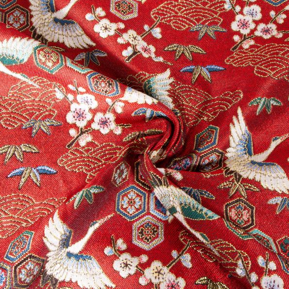 Tissu Jacquard d'ameublement tissé teint Grues sur fond Rouge - Par 10 cm