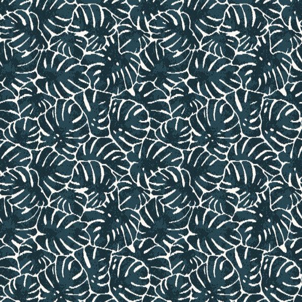 Tissu Jacquard Feuilles Monstera sur fond Bleu canard - Par 10 cm