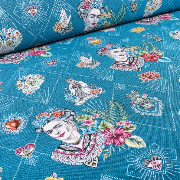 Tissu Jacquard Frida Kahlo sur fond Bleu - Par 10 cm