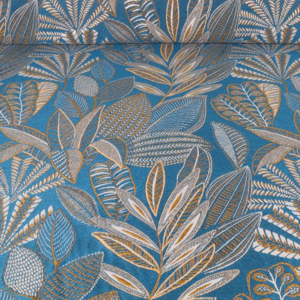 Tissu Jacquard Grandes fleurs Lagende sur fond Bleu canard - Par 10 cm
