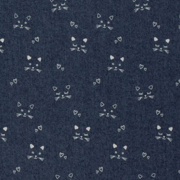 Tissu Jean Denim extensible Chats blancs sur fond Bleu marine - Par 10 cm