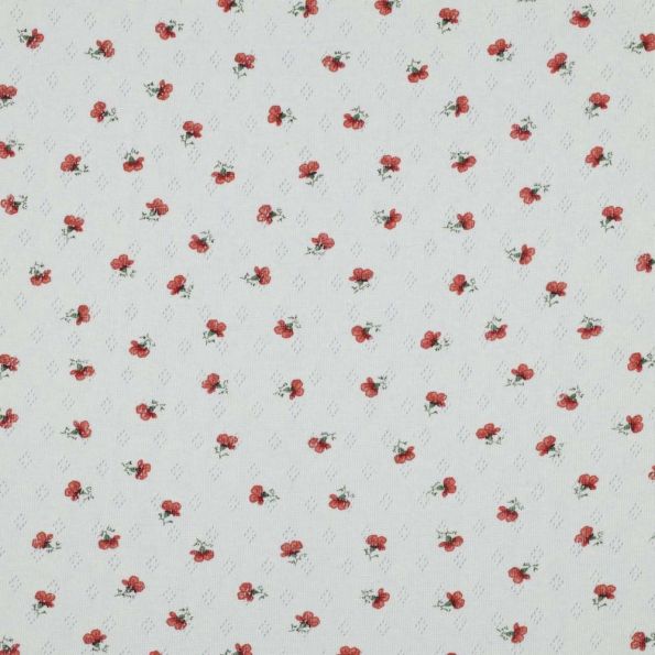 Tissu Jersey Coton ajouré Petites roses rouges sur fond Blanc - Par 10 cm