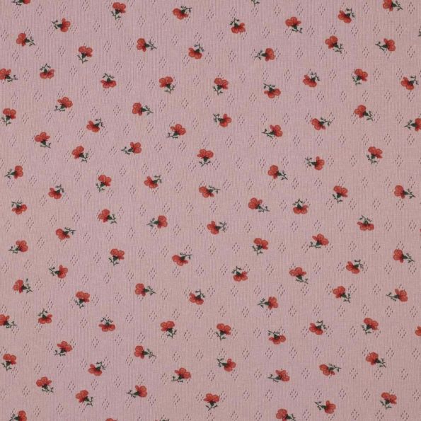 Tissu Jersey Coton ajouré Petites roses rouges sur fond Rose - Par 10 cm