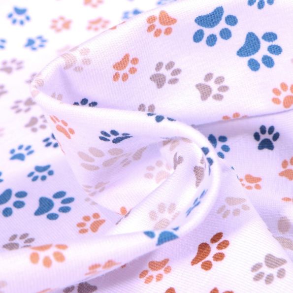 Tissu Jersey Coton Bio Pattes de chiens sur fond Blanc - Par 10 cm