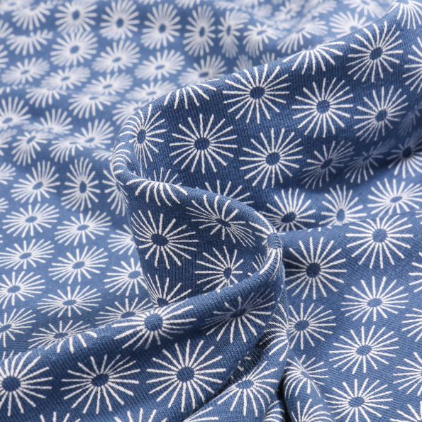 Tissu Jersey Coton Camille Soleils sur fond Bleu denim - Par 10 cm
