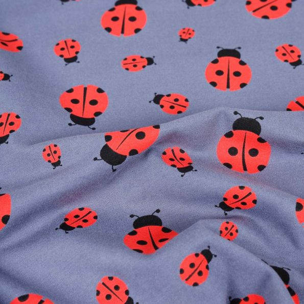 Tissu Jersey Coton Coccinelles sur fond Bleu denim - Par 10 cm