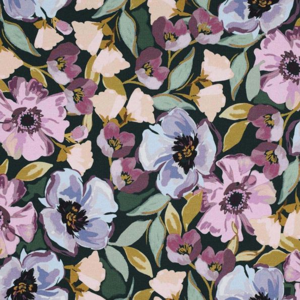 Tissu Jersey Coton digital Grandes fleurs lilas et bleu sur fond Noir - Par 10 cm