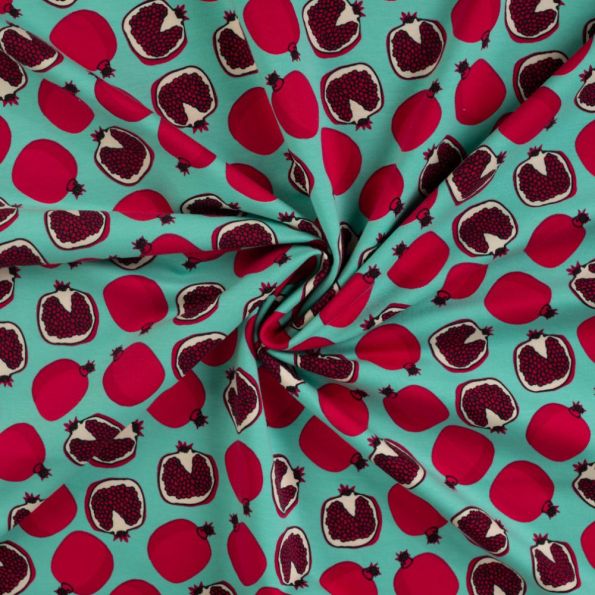 Tissu Jersey Coton envers gratté Grenades rouges sur fond Vert menthe - Par 10 cm
