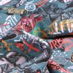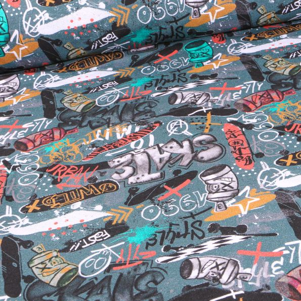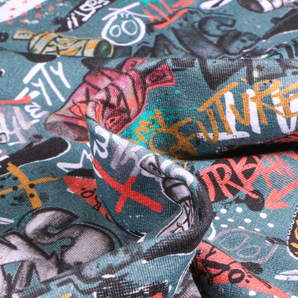 Tissu Jersey Coton envers gratté Street art sur fond Vert d'eau - Par 10 cm