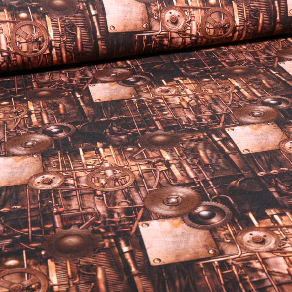 Ce tissu coton imprimé Méca est solide et de belle qualité, idéal pour vos réalisations de vêtements, accessoires de mode et décoration d'intérieur.