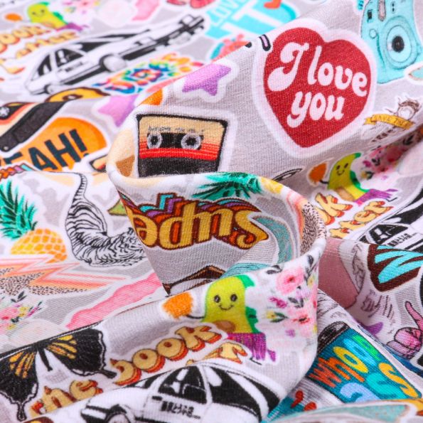 Ce tissu Jersey de Coton Good Vibes est un tissu de belle qualité, épais et extensible, stable à coudre. Il sera parfait pour confectionner des T-shirts, tops, legging, sarouels…
