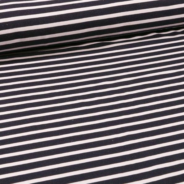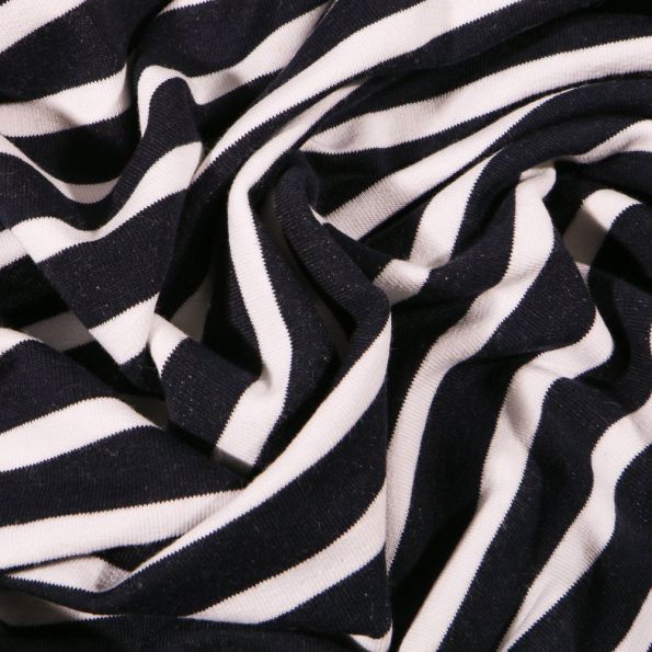 Ce tissu jersey de coton marinière est un tissu de belle qualité, légèrement plus épais qu'un jersey de coton classique, stable à coudre. Il sera parfait pour confectionner des T-shirts, tops, legging, sarouels...