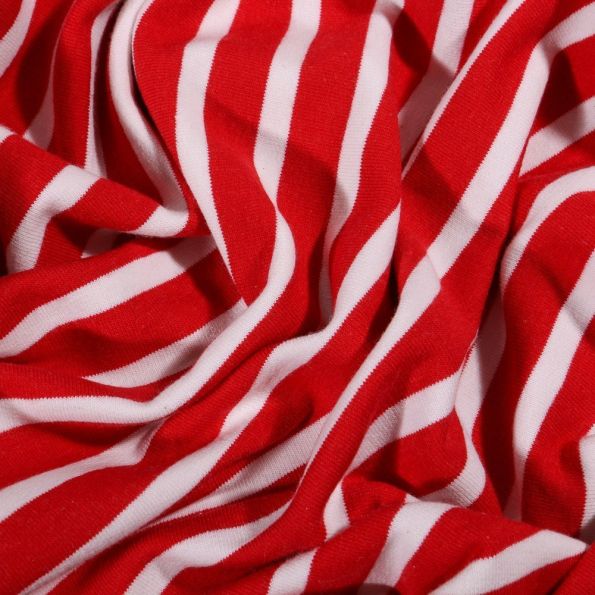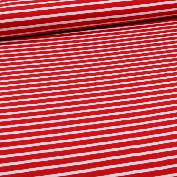 Tissu Jersey Coton marinière épais Rayures blanches sur fond Rouge - Par 10 cm