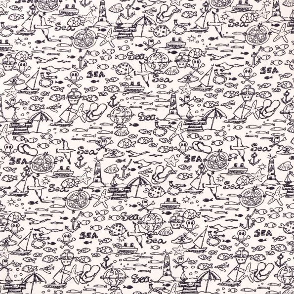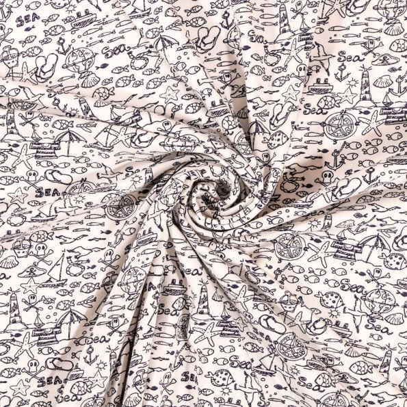 Tissu Jersey Coton Motifs bord de mer bleu marine sur fond Ecru - Par 10 cm