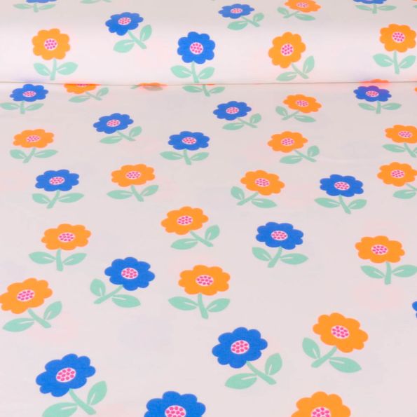 Tissu Jersey Coton Poppy Fleurs bleues et orange fluo sur fond Blanc - Par 10 cm