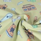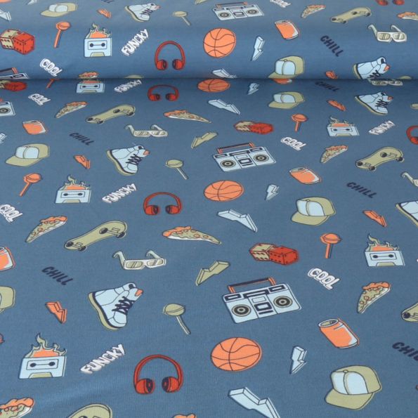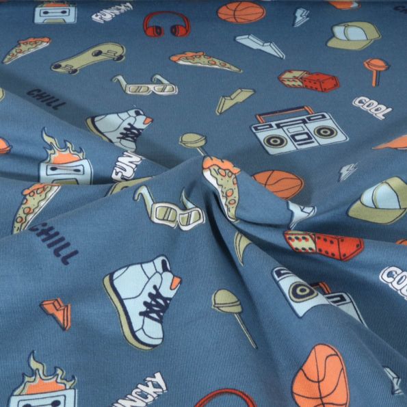 Tissu Jersey Coton Poppy Streetwear urbain sur fond Bleu denim - Par 10 cm
